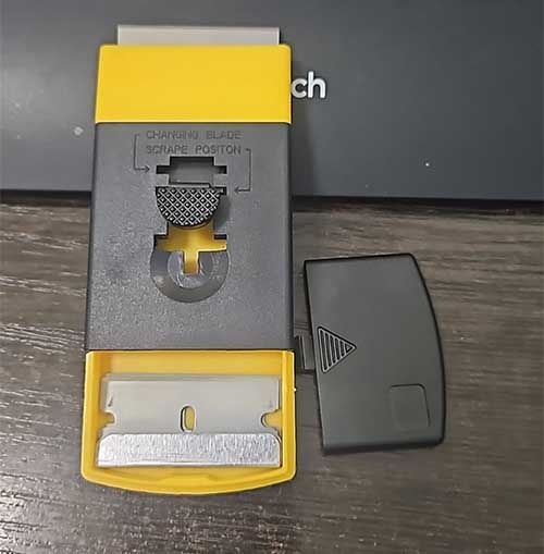 - запас лезвий - 1 на скребке и 2 дополнительные лезвия спрятаны в корпусе скребка и их всегда можно быстро заменить.